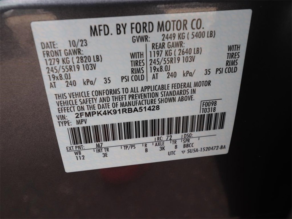 ALLOY WHEELS, BACK UP CAMERA, BLUETOOTH, KEYLESS ENTRY, LEATHER SEATING, ECOBOOST POWER, FORD PASS CONNECT, HOT SPOT TELEMATICS MODEM, REMAINDER OF FACTORY WARRANTY!, 4G/LTE WIFI HOTSPOT!, FORD DEALER SERVICED! FORD CERTIFIED!, FULLY SERVICED! READY TO ROLL!, BEST SELECTION! CERTIFIED PROTECTION!, RELIABLE AS SUNRISE!, PLEASE SEE 1 OWNER FLAWLESS CARFAX!, RECON INCLUDED NO HIDDEN FEES!, ADULT OWNED, PRIDE IN OWNERSHIP SHOWS, DONT DELAY, FREE FACTORY CERTIFIED PROTECTION! ONLY AT JARRETT SCOTT!, APPLE CAR PLAY!, AWD, 12 Speakers, 4-Wheel Disc Brakes, ABS brakes, ActiveX-Trimmed Heated Sport Bucket Seats, Air conditioning, Alloy wheels, AM/FM radio: SiriusXM with 360L, Auto High-beam Headlights, Automatic temperature control, Brake assist, Delay-off headlights, Dual front impact airbags, Dual front side impact airbags, Electronic Stability Control, Equipment Group 300A, FordPass Connect, Four wheel independent suspension, Front Bucket Seats, Front dual zone A/C, Front fog lights, Fully automatic headlights, Heated door mirrors, Memory seat, Panic alarm, Power door mirrors, Power driver seat, Power Liftgate, Power steering, Power windows, Radio: B&O Sound System by Bang & Olufsen, Remote keyless entry, Security system, SiriusXM w/360L, Speed control, Speed-Sensitive Wipers, Split folding rear seat, Spoiler, Steering wheel mounted audio controls, SYNC 4A w/Enhanced Voice Recognition, Tachometer, Telescoping steering wheel, Tilt steering wheel, Traction control, Trip computer, Turn signal indicator mirrors, Variably intermittent wipers.