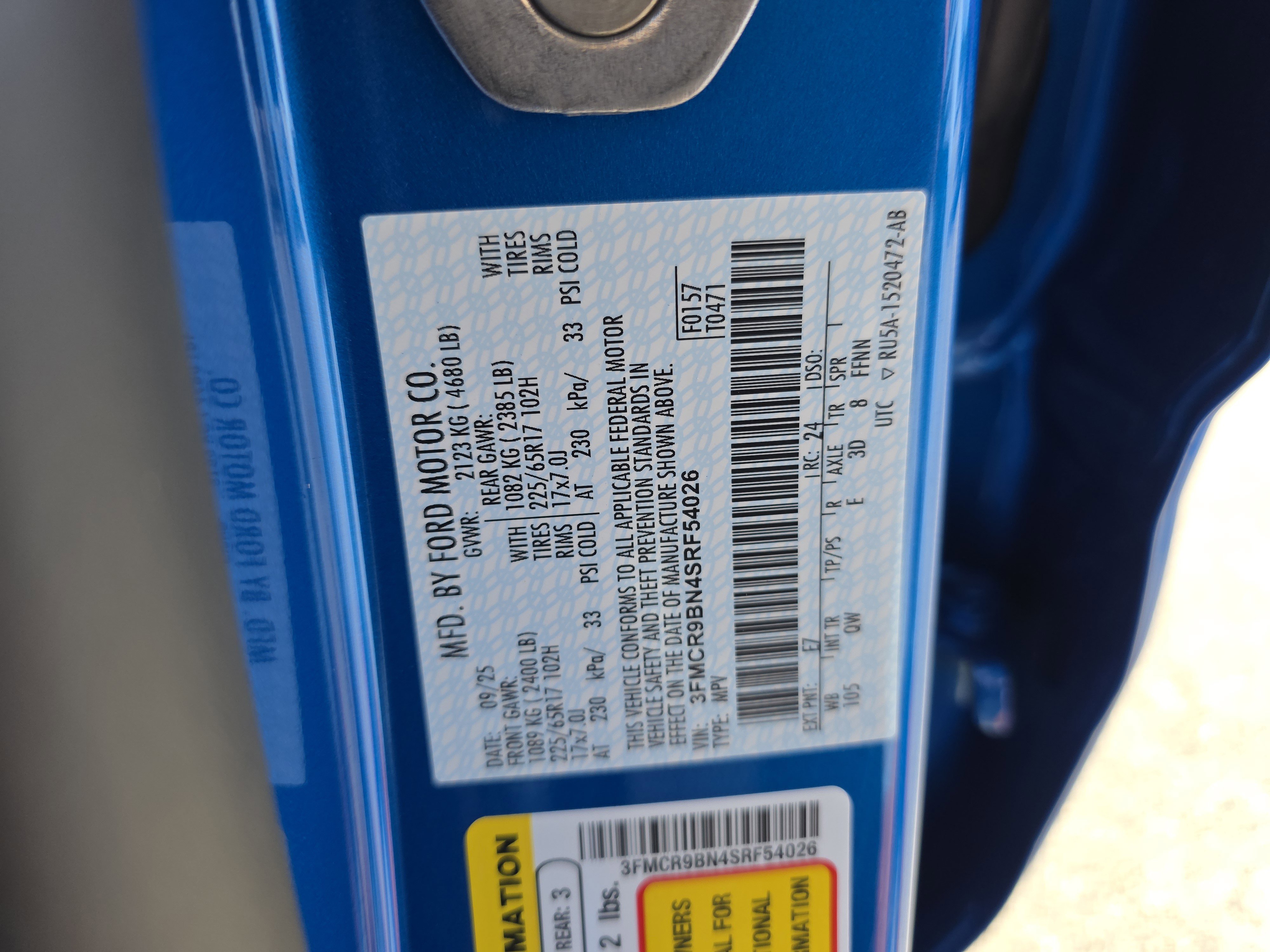 • VIN # 3FMCR9BN4SRF54026