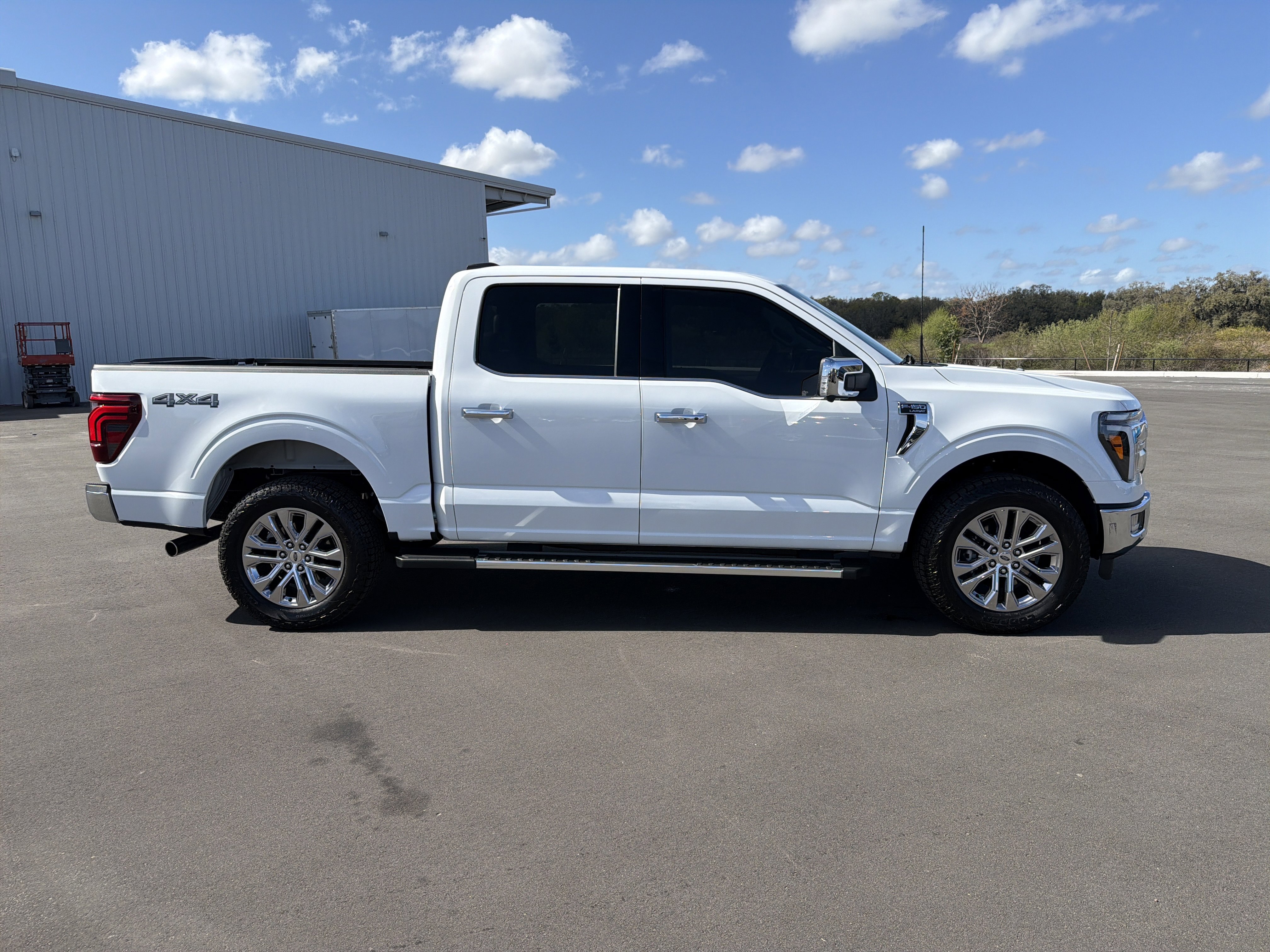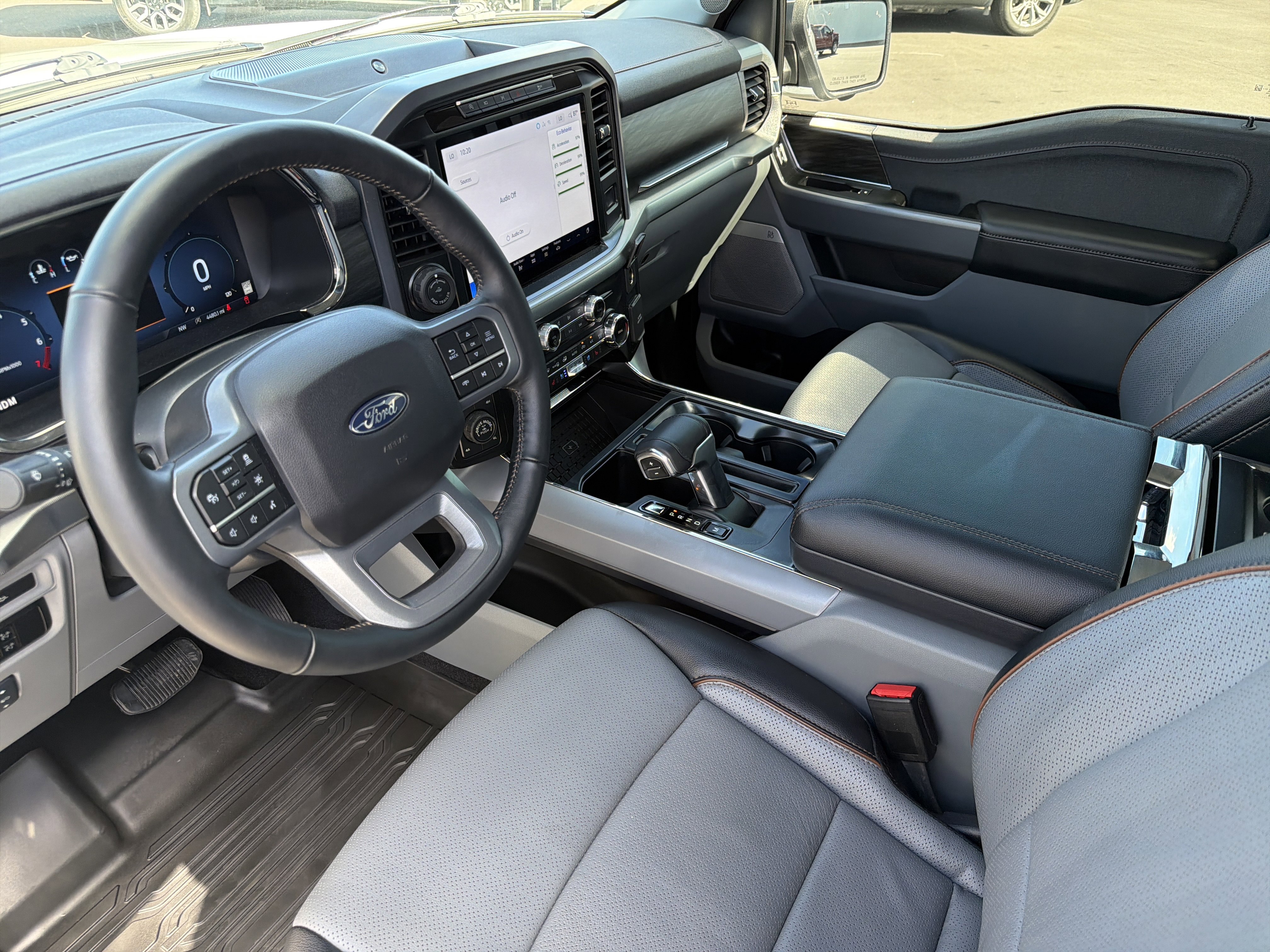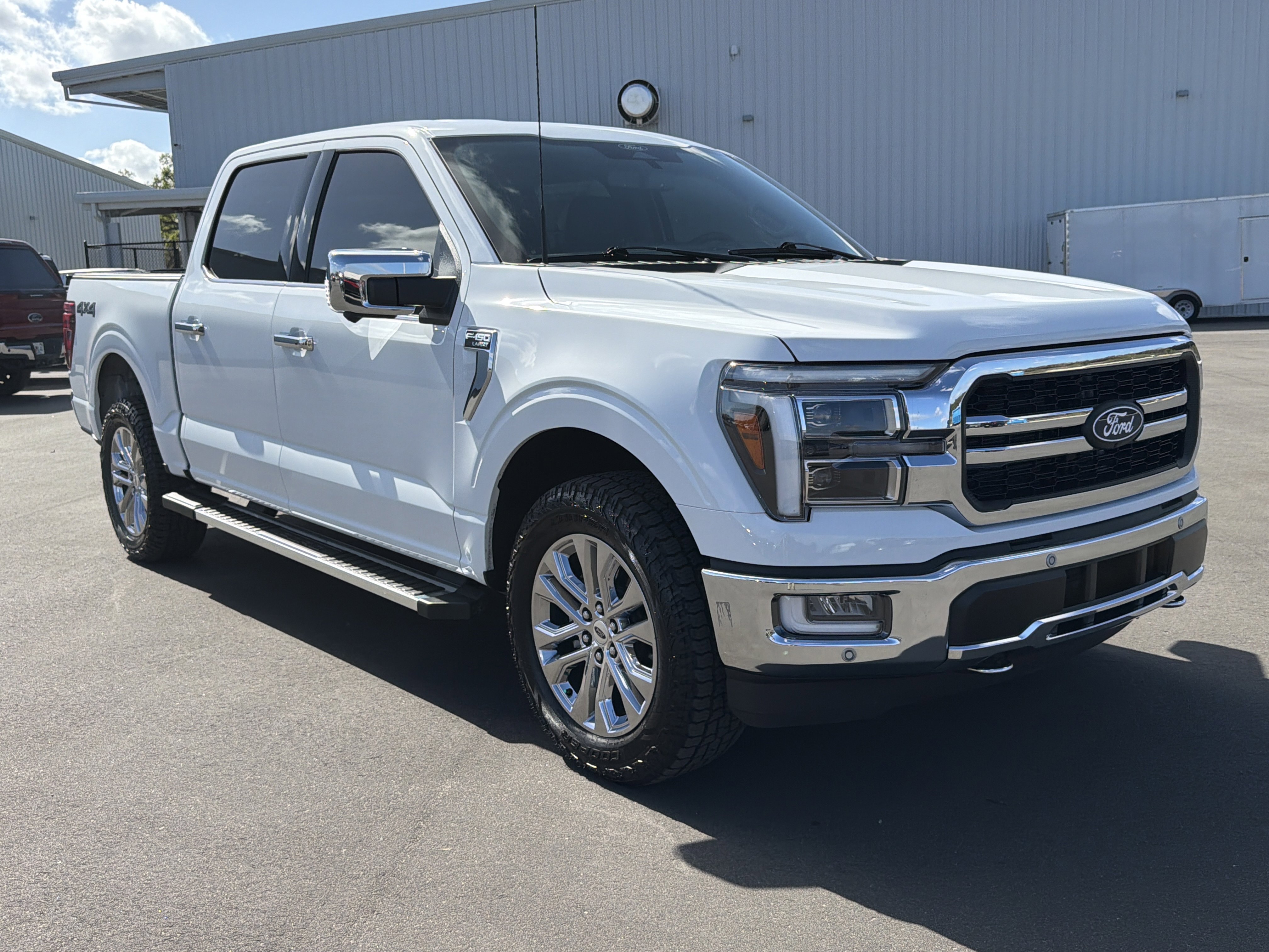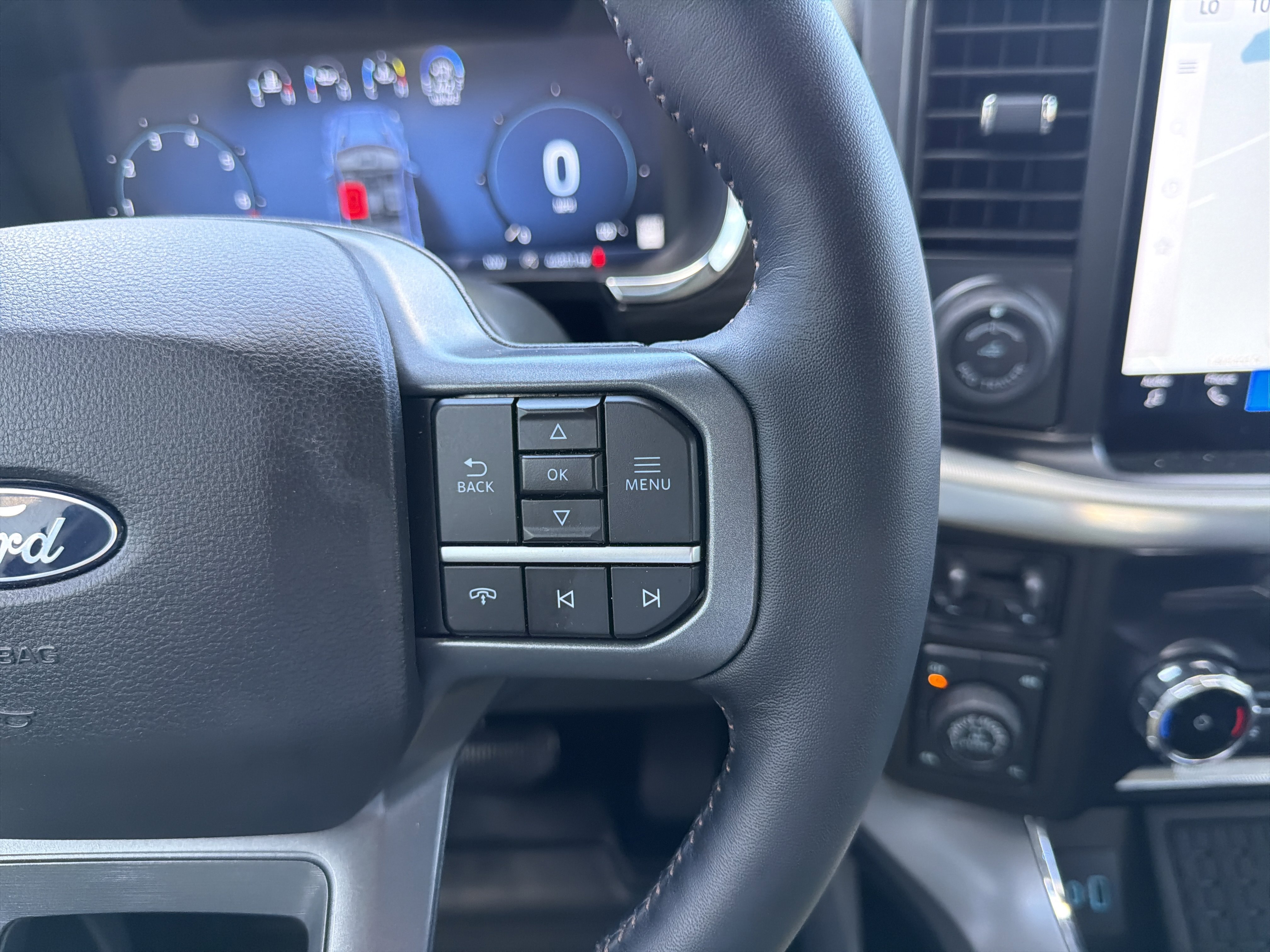 Certified. Oxford White 2024 Ford F-150 Lariat 4WD 10-Speed Automatic 3.5L V6 EcoBoost 4WD, 4 Pickup Box Tie-Down Plates, 4-Wheel Disc Brakes, 6 Extended Running Boards, 8 Speakers, ABS brakes, Adjustable pedals, Air Conditioning, AM/FM radio: SiriusXM with 360L, Auto High-beam Headlights, Auto-dimming door mirrors, Auto-dimming Rear-View mirror, Automatic temperature control, Bed Utility Package, Brake assist, Bumpers: chrome, Compass, Console Worksurface, Delay-off headlights, Driver door bin, Driver vanity mirror, Dual front impact airbags, Dual front side impact airbags, Electronic Stability Control, Emergency communication system: SYNC 4 911 Assist, Equipment Group 501A Standard, Front anti-roll bar, Front Bucket Seats, Front Center Armrest, Front dual zone A/C, Front fog lights, Front reading lights, Front wheel independent suspension, Fully automatic headlights, Garage door transmitter, Heated door mirrors, Heated front seats, Heated steering wheel, Illuminated entry, Integrated Trailer Brake Controller, Leather-Trimmed Bucket Seats, LED Box Lighting, Low tire pressure warning, Memory seat, Mobile Office Package, Navigation system: Connected Navigation, Occupant sensing airbag, Outside temperature display, Overhead airbag, Overhead console, Panic alarm, Partitioned Lockable Rear Storage, Passenger vanity mirror, Pedal memory, Power door mirrors, Power driver seat, Power passenger seat, Power steering, Power Tailgate, Power windows, Pro Access Tailgate, Radio data system, Radio: B&O Sound System by Bang & Olufsen, Rain sensing wipers, Rear reading lights, Rear seat center armrest, Rear step bumper, Rear window defroster, Remote keyless entry, Security system, Speed control, Split folding rear seat, Steering wheel mounted audio controls, SYNC 4 w/Enhanced Voice Recognition, Tachometer, Telescoping steering wheel, Tilt steering wheel, Tough Bed Spray-In Bedliner, Tow/Haul Package, Traction control, Trip computer, Turn signal indicator mirrors, Variably intermittent wipers, Ventilated front seats, Voltmeter, Wheels: 20 Chrome-Like PVD, Wireless Charging.
